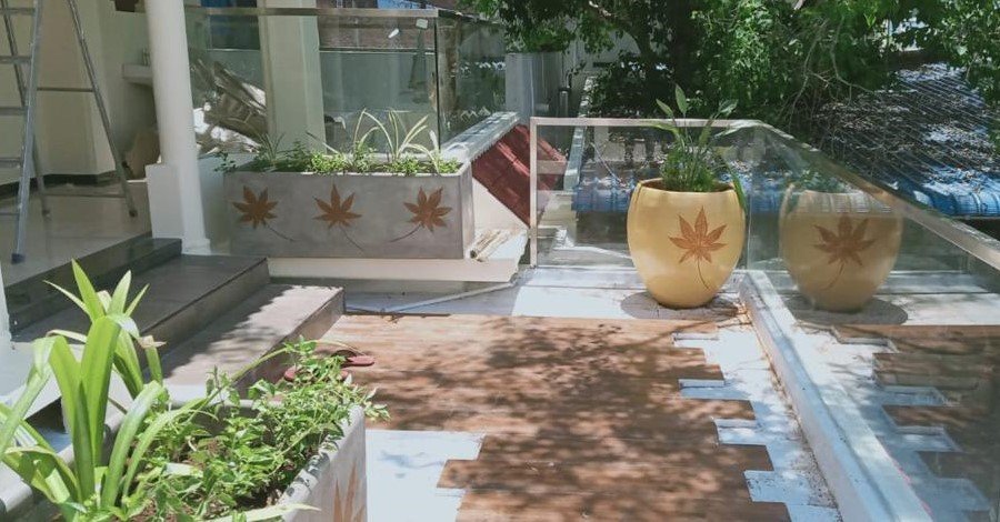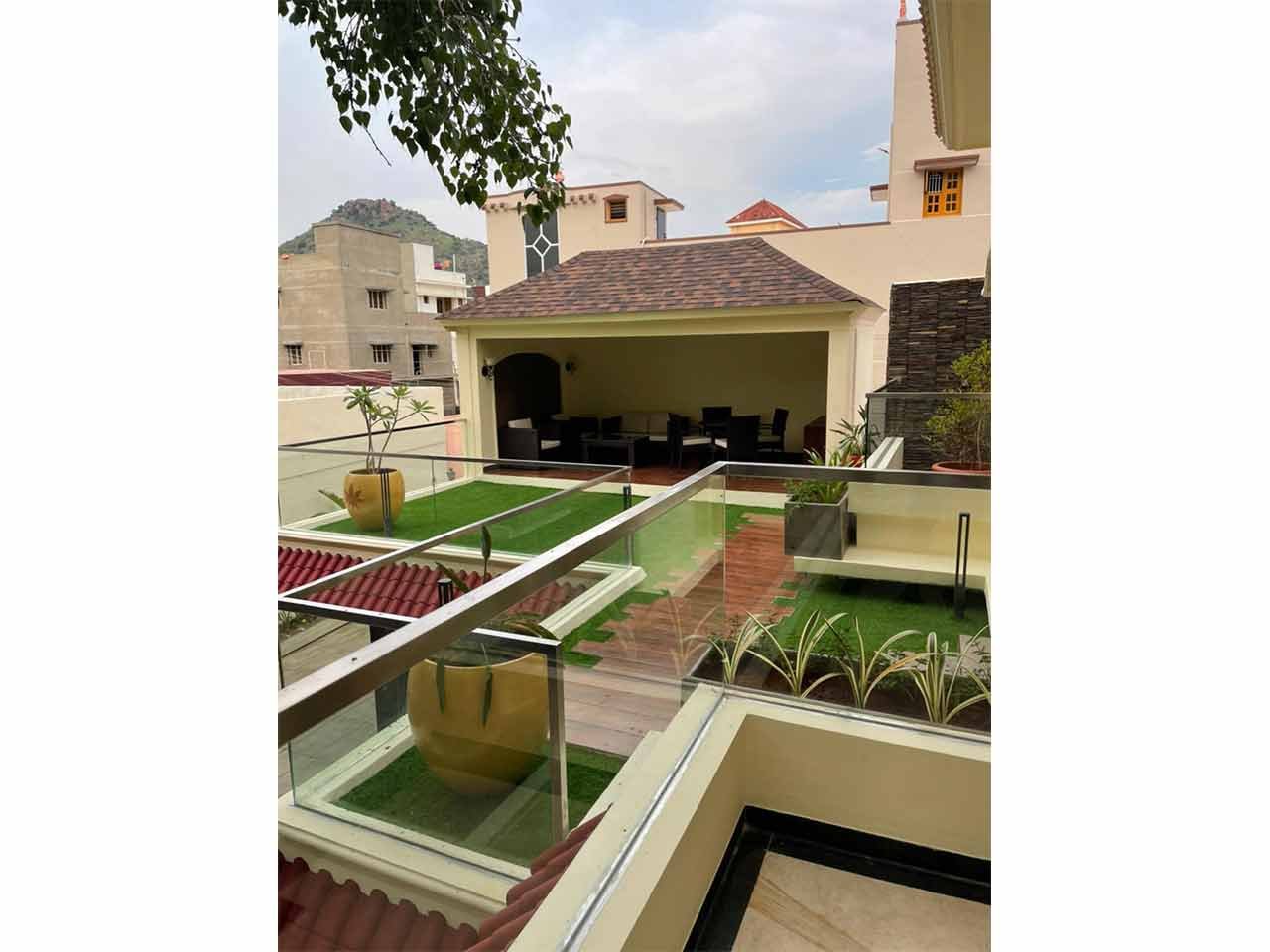his contemporary Gazebo with a Terrace Garden was designed & executed by us for an existing residential Villa close to Madurai. The gazebo was designed in contemporary style with sheet roofing and houses a bar with a seating units. The Gazebo overlooks a minimalistic terrace garden with a lawn and colourful planters which infuse much needed colour the otherwise quiet subdued space. Arun’s Residence With Terrace Garden