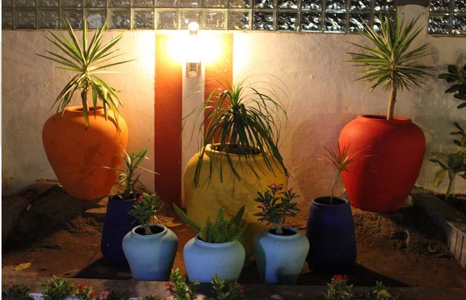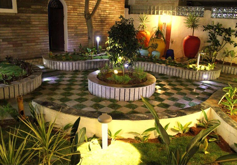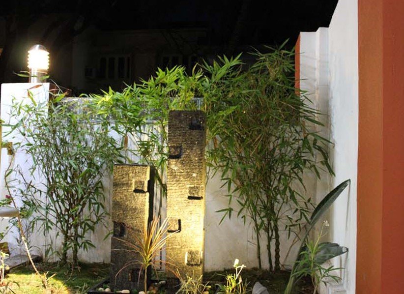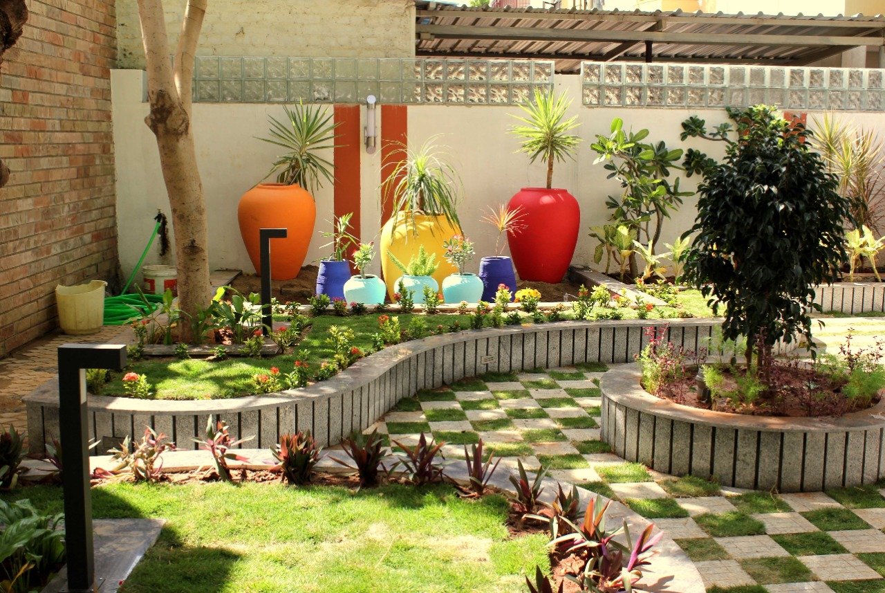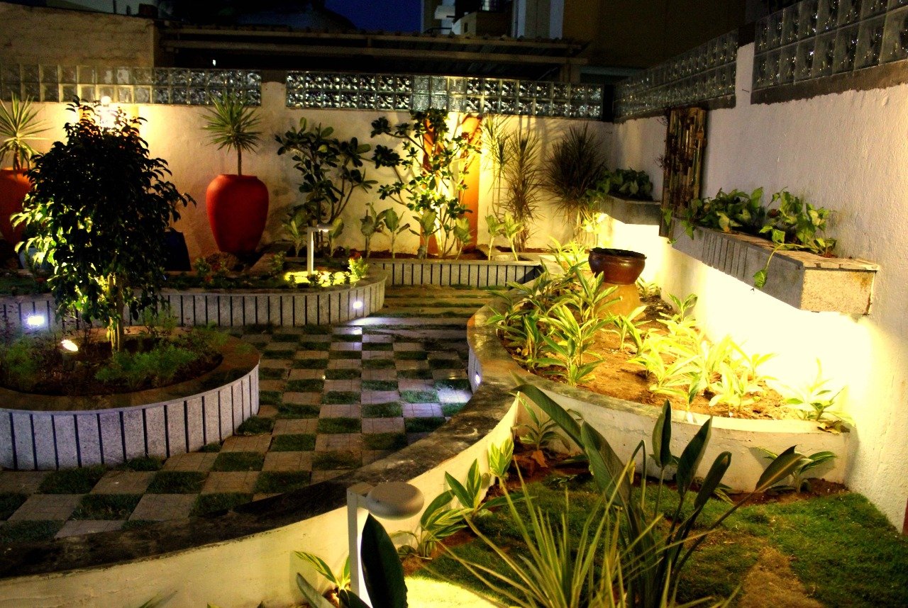 The garden was designed keeping in mind the busy lifestyle of the doctor. The garden was proposed to be a fresh visual focus of relaxation & rest for the start or end of the day. The Extensive hardscape details features granite stone individually selected & cut to shape. The central space features a checked patterned walkway with exotic planting to complement the rich looking landscape space. Glass block were used on the compound wall to provide a privacy screening as well as allow ample light to come through. Colourful terracotta pots specifically designed and sourced for the project add a burst of colours to the space. We have designed every aspect of space including hardscaping- Granite details, soft scaping-plant material selection & placement & landscape lighting. Dr. Sabitha’s Residence